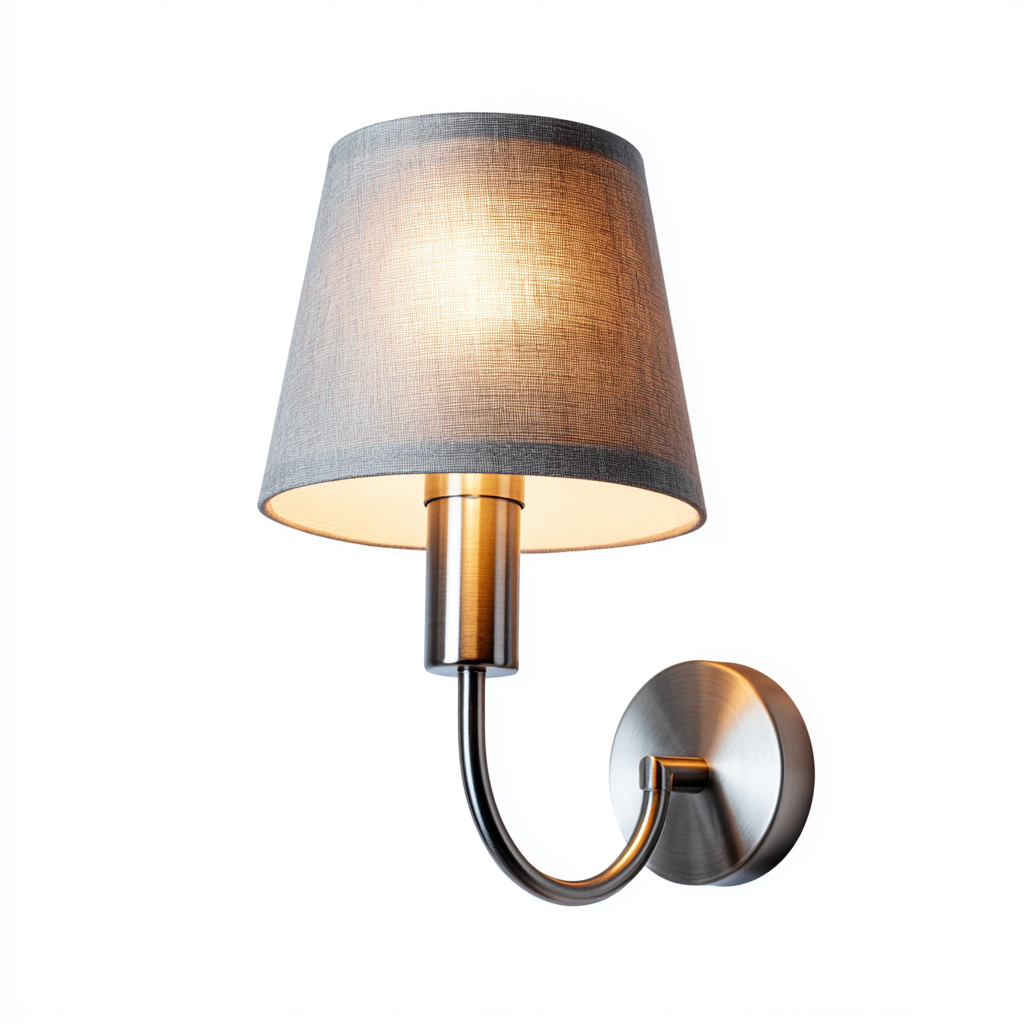 Aplique de pared con estructura metálica niquelada y pantalla de tela gris con forma cónica, adecuado para salones, dormitorios o pasillos de estilo moderno.