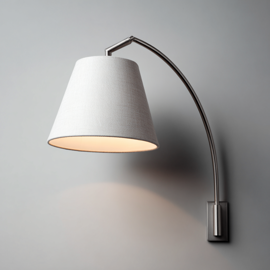 Aplique de pared con estructura metálica en acero inoxidable y pantalla de tela blanca con forma cónica, adecuado para salones, dormitorios o zonas de lectura con estilo moderno.
