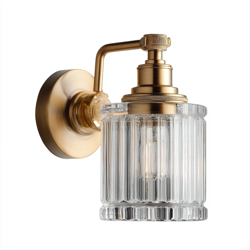 Aplique de pared con estructura metálica en acabado laton y pantalla de vidrio transparente con relieve vertical, adecuado para dormitorios, pasillos o baños con un estilo vintage.