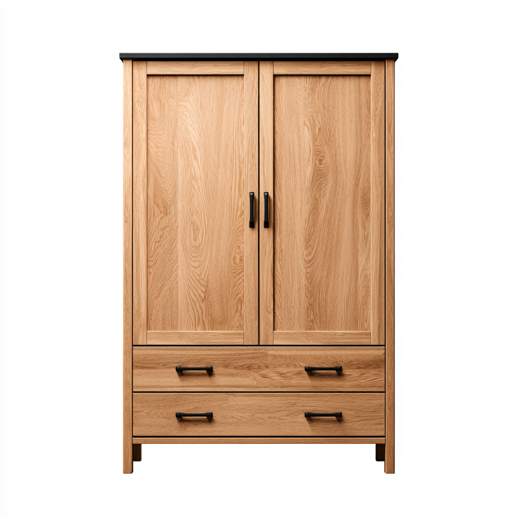 Armario de estilo moderno fabricado en madera con acabado natural y detalles metálicos negros. Su diseño sencillo y equilibrado ofrece una solución práctica para organizar prendas y accesorios en interiores.
