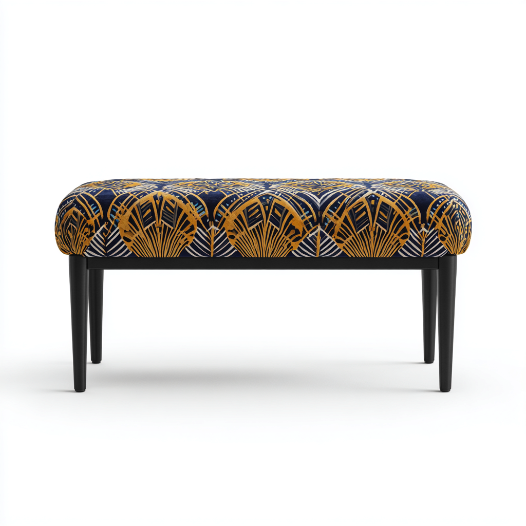 Banco de dormitorio tapizado en tela estampada con motivos geométricos en tonos azul y amarillo. Su estética art déco aporta un carácter decorativo para interiores.