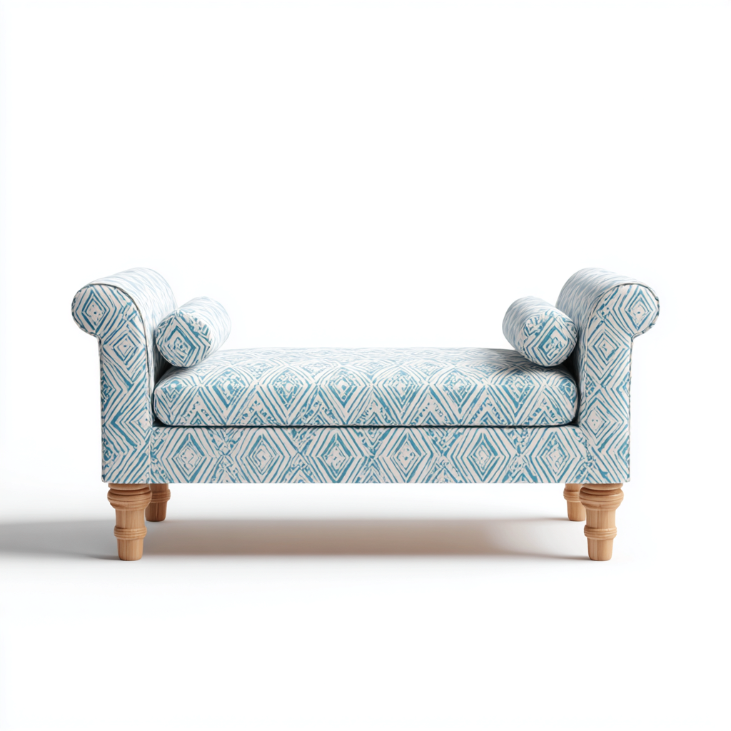Banco de dormitorio tapizado en tela estampada en tonos azul y blanco con estructura de madera y patas torneadas. Su estilo clásico aporta un carácter decorativo distintivo para interiores.