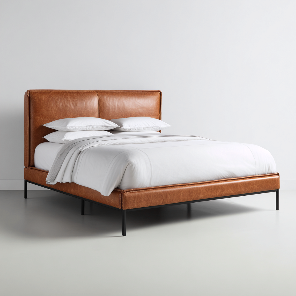 El cabecero y la base están recubiertos de cuero marrón claro con textura uniforme. Las patas metálicas negras proporcionan estabilidad y un contraste visual que refuerza el estilo moderno.