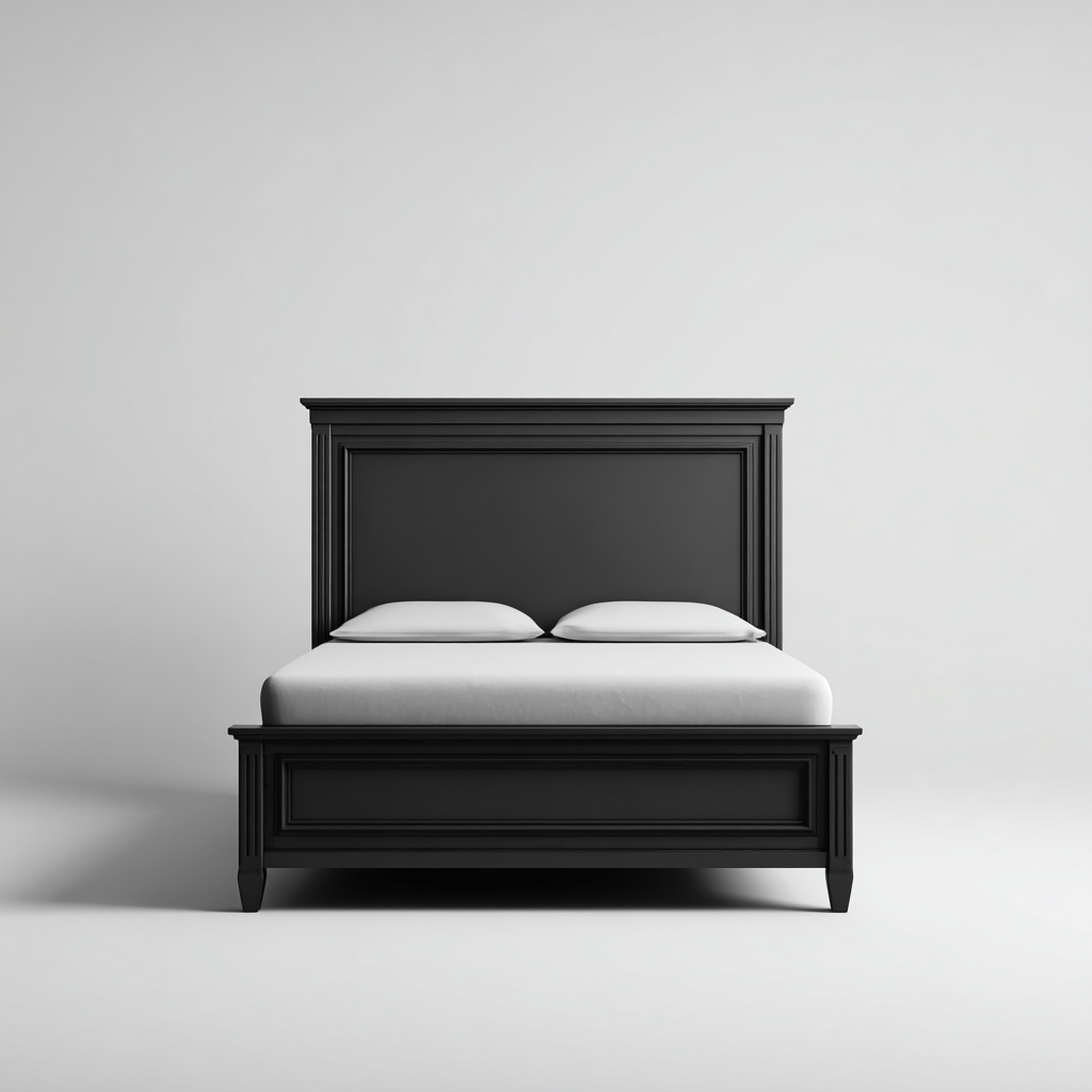 La estructura está fabricada en madera negra con acabado liso y detalles decorativos. Los paneles del cabecero y pie de cama refuerzan un estilo tradicional con un aspecto refinado.