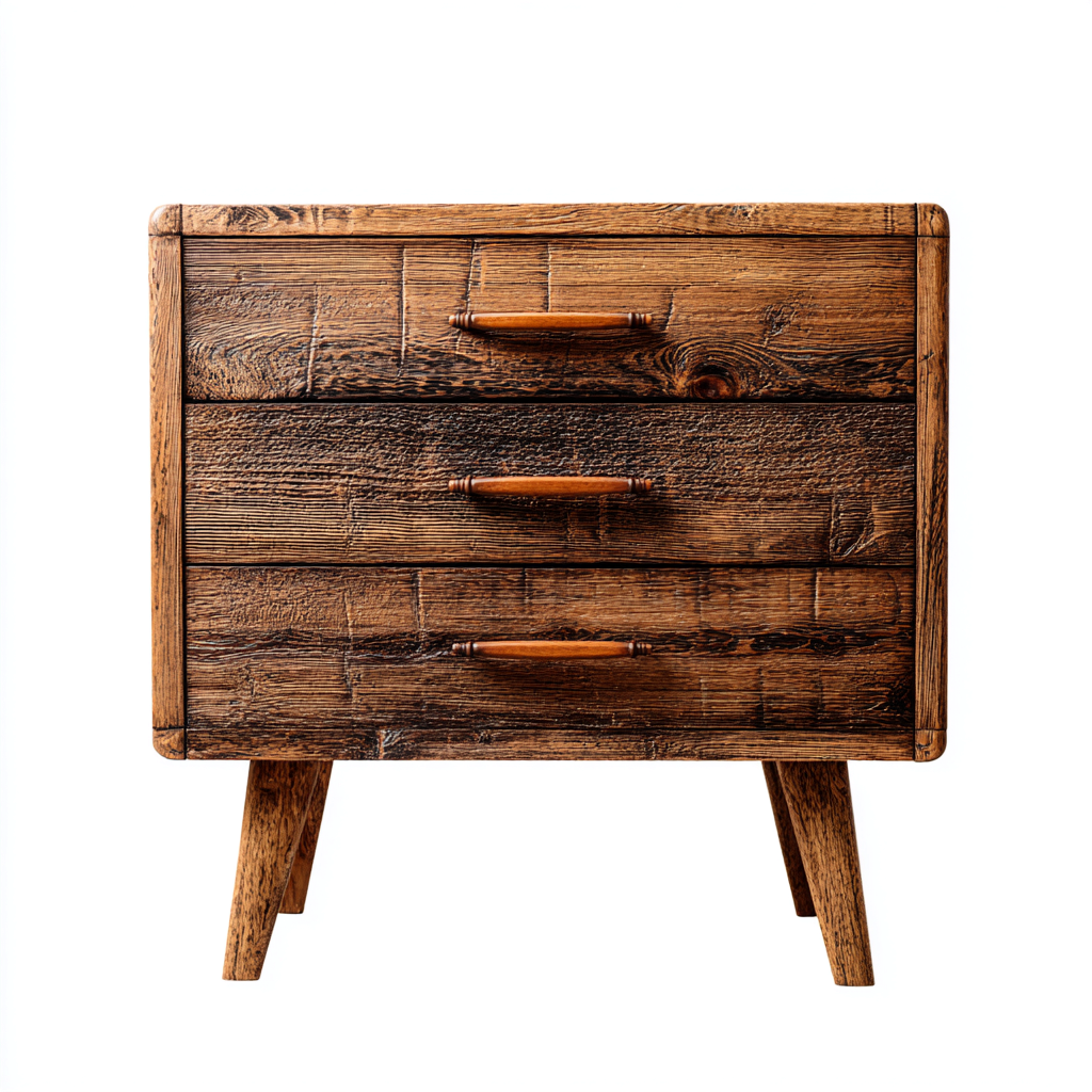 Fabricada en madera en color marrón con un acabado rústico que resalta las variaciones naturales de la superficie. Los tiradores de madera proporcionan firmeza y una sensación agradable al tacto.