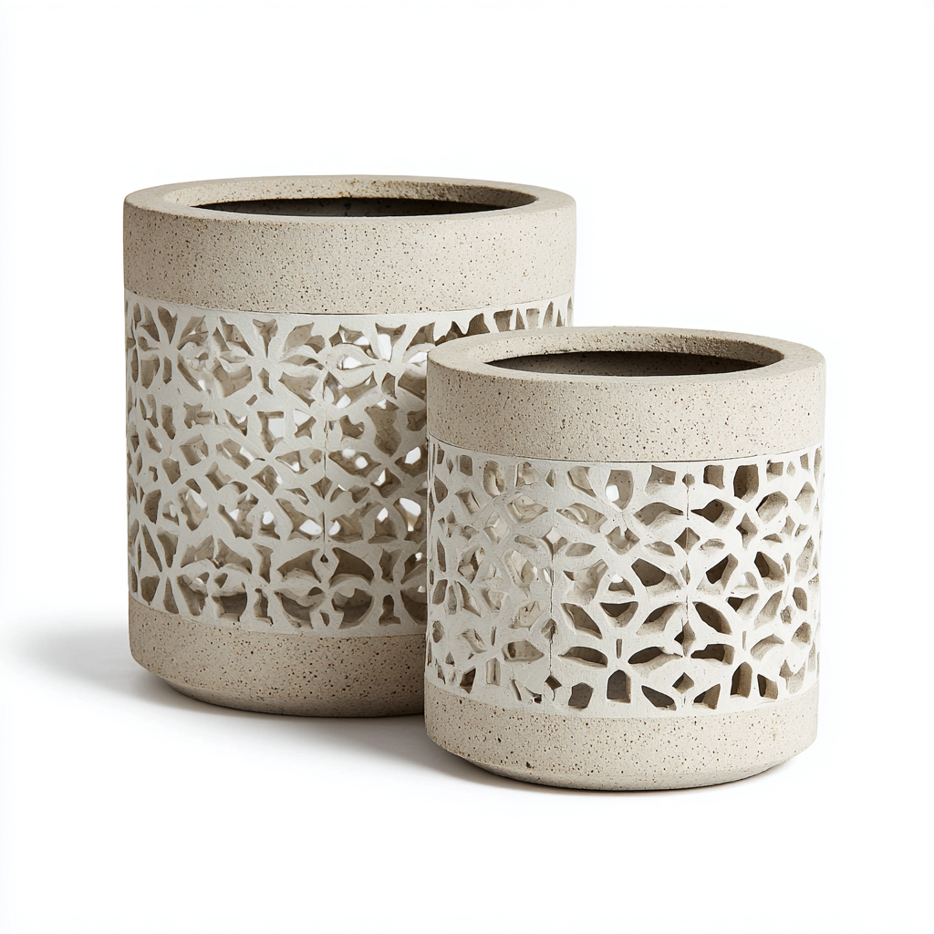 Elaboradas en hormigón en tono beige con textura natural. El recorte ornamental añade profundidad visual y permite integrar las macetas en distintos ambientes decorativos.