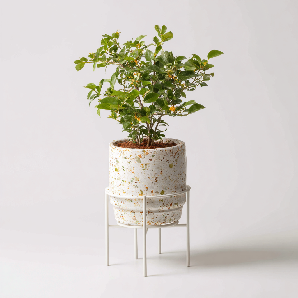 Conjunto decorativo de estilo moderno compuesto por una maceta de cerámica con acabado terrazo en tonos blanco y multicolor y un soporte metálico blanco que eleva y estabiliza la pieza, adecuado para distintos espacios interiores.