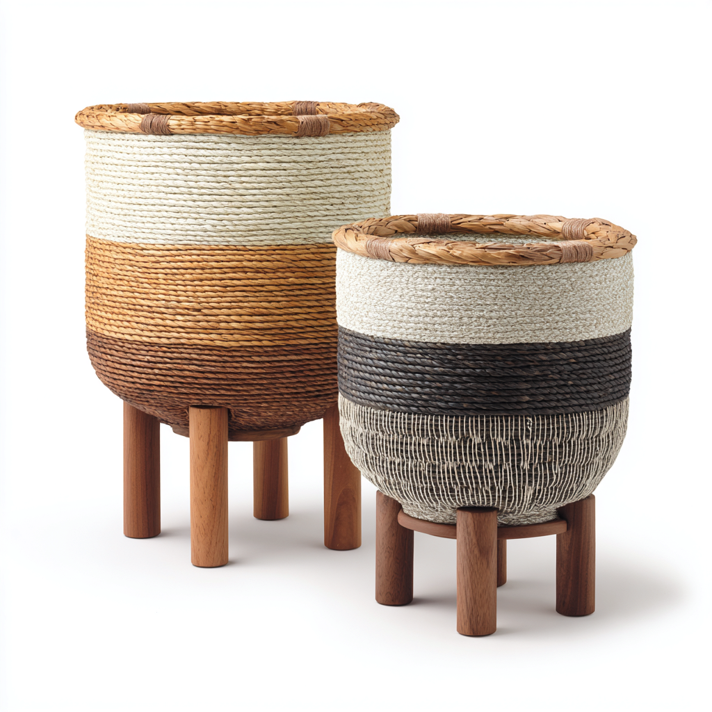 Este conjunto de macetas con soportes de madera presenta un estilo rústico inspirado en la artesanía natural. Las piezas combinan cuerpos tejidos con bases elevadas que realzan plantas decorativas en interiores, aportando calidez y equilibrio visual.