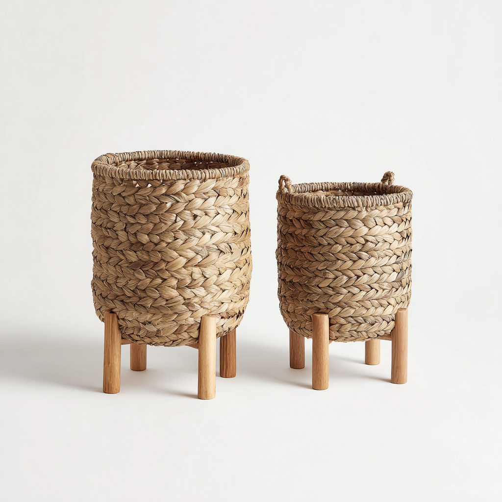 Las macetas están elaboradas con fibra vegetal trenzada en tono natural. Los soportes son de madera maciza con un acabado suave que refuerza su estabilidad y aporta una estética cálida.