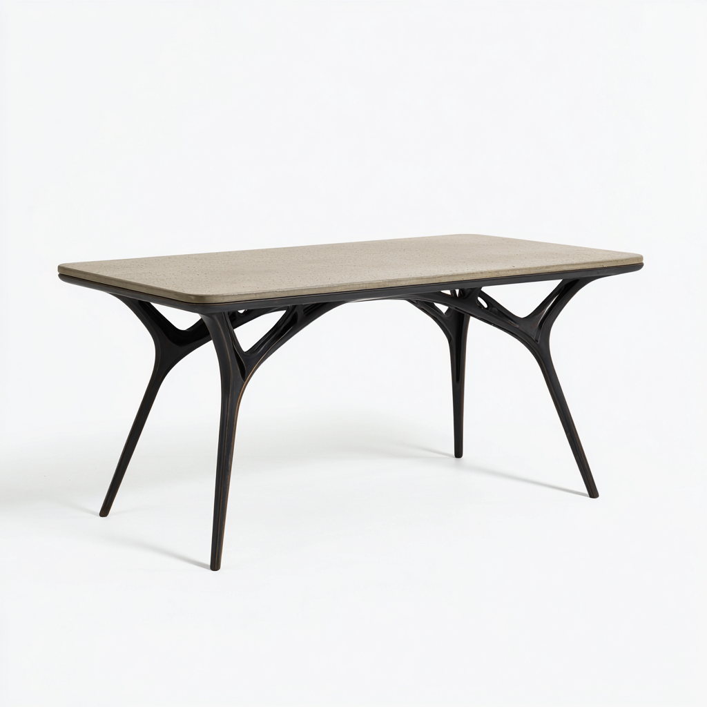 La superficie está elaborada en piedra sintética en tono beige, mientras que la base incorpora una estructura metálica en color negro. Ambos materiales ofrecen buena resistencia frente al uso cotidiano y mantienen un acabado uniforme.