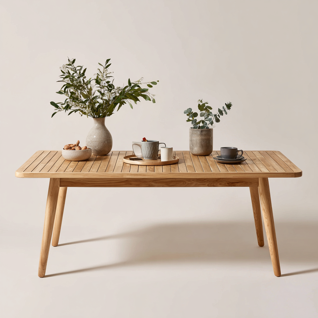 Mesa de jardín de madera maciza con tablero de listones y silueta equilibrada para crear un área funcional en espacios exteriores. Ofrece una superficie amplia para comidas y complementos.