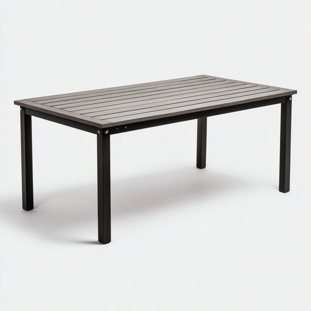 Mesa de jardín con tablero de lamas en madera sintética y estructura metálica estable. Su diseño moderno facilita la integración en terrazas y jardines.