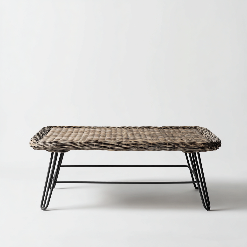 El tablero en ratán sintético marrón presenta una textura natural y resistente, mientras que la base metálica negra aporta solidez y un estilo contemporáneo.