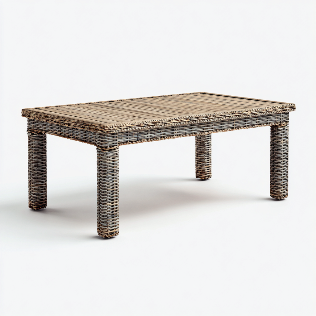 La estructura combina ratán sintético trenzado y una superficie superior de láminas de madera en tonos marrón y dorado. Los materiales están tratados para soportar el uso continuado en exteriores.