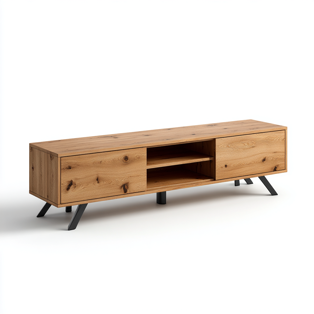 Este mueble de TV combina una estructura de madera con un diseño elevado sobre patas metálicas inclinadas, ofreciendo una estética rústica con un toque contemporáneo. Su formato amplio permite integrar el televisor y los accesorios manteniendo una apariencia ordenada.