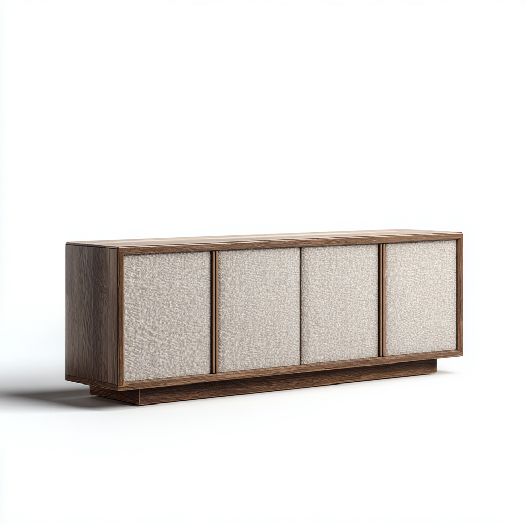 Este mueble de TV destaca por su estética suave y equilibrada, combinando un cuerpo robusto con paneles frontales tapizados que aportan textura y serenidad visual al salón.