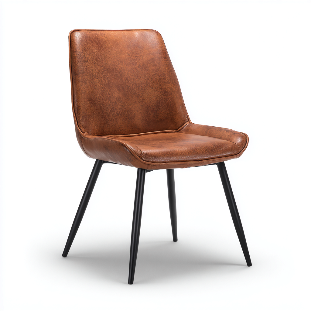 Esta silla de comedor presenta un diseño moderno con líneas suaves y un tapizado en polipiel marrón que aporta un estilo cálido y contemporáneo. Su forma ligeramente envolvente la convierte en una pieza adecuada para comedores, cocinas y áreas de estar.