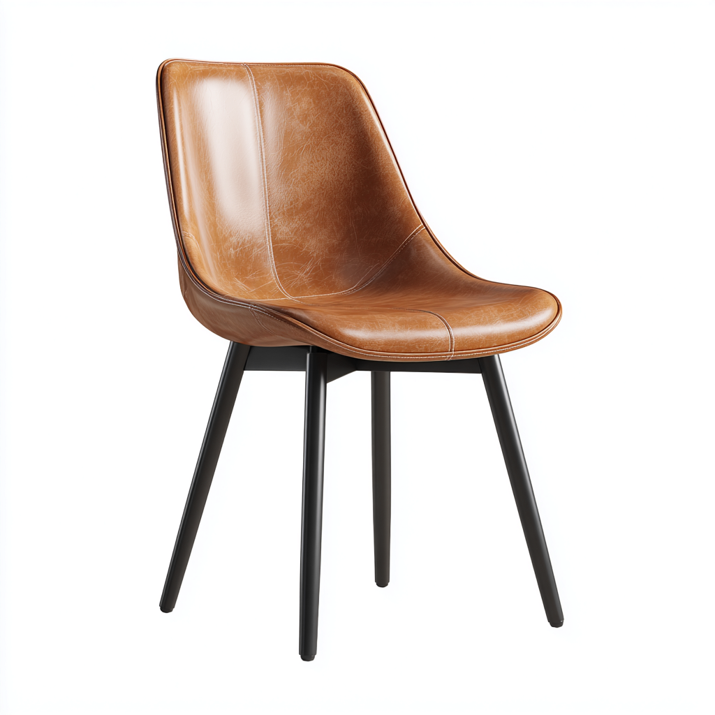 Esta silla de comedor presenta un diseño moderno con una carcasa continua tapizada en polipiel marrón, ofreciendo una apariencia elegante y cálida. Su silueta curva permite integrarla fácilmente en comedores, cocinas o áreas de estar.