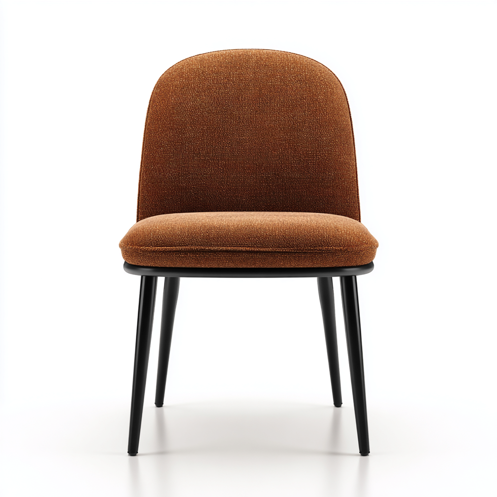 El asiento y el respaldo están tapizados en tela marrón de textura suave y agradable al tacto. Las patas metálicas con acabado negro proporcionan una base estable y resistente para el uso diario.