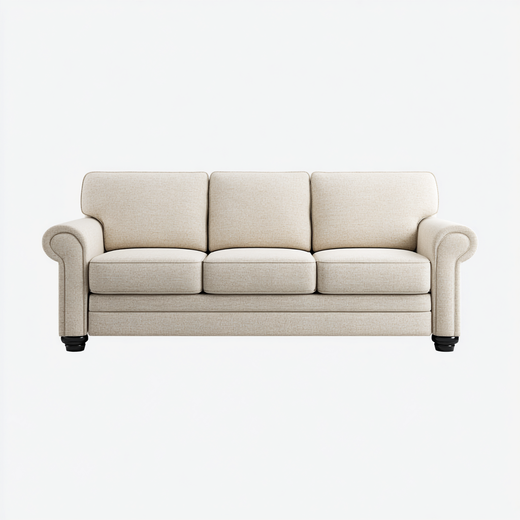El sofa esta tapizado en tela beige de textura fina y resistente, mientras que su estructura interna esta reforzada para garantizar durabilidad y estabilidad.