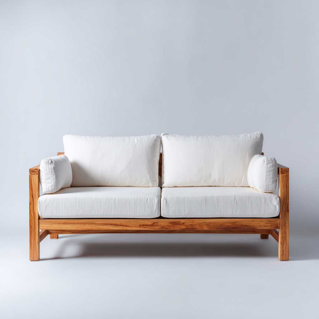 Sofá de jardín con estructura de madera maciza y cojinería en tono blanco. Su diseño recto y equilibrado combina líneas limpias con una presencia cálida, adecuado para ambientes exteriores contemporáneos o naturales.