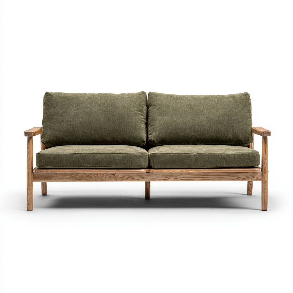 La estructura está elaborada en madera con un acabado natural que resalta la veta. Los cojines están confeccionados en tela resistente y suave al tacto, en tono verde, indicada para espacios exteriores protegidos.