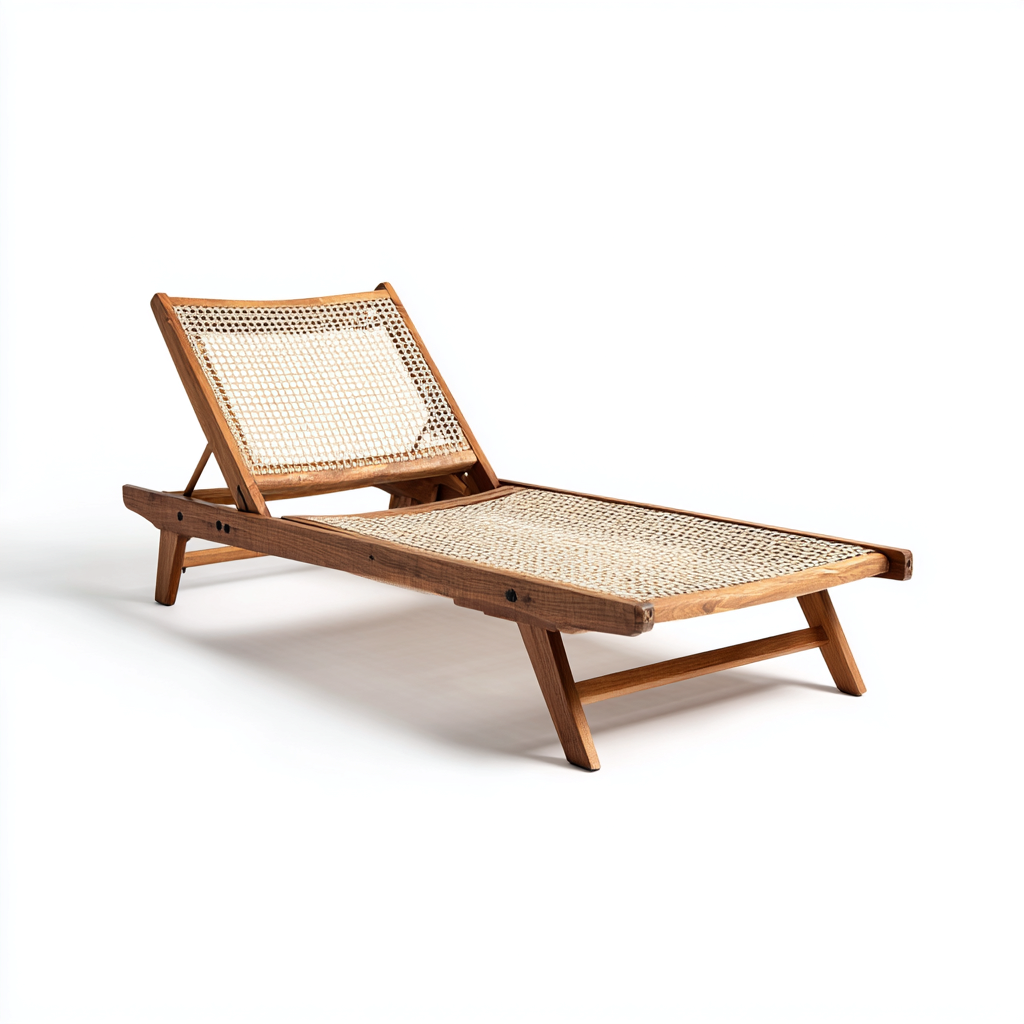 Tumbona de jardín diseñada para uso exterior, con estructura de madera y superficie en tejido natural de estilo trenzado que proporciona soporte cómodo al descansar en terrazas, jardines y zonas de piscina. La forma alargada facilita mantener una postura extendida y el respaldo ajustable permite encontrar una inclinación adecuada.